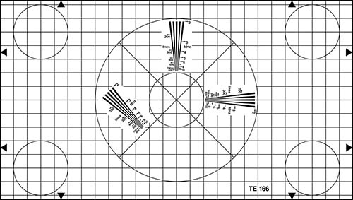 在浅色背景上布置有25条水平线和15条垂直线的网格结构。 网格线的宽度为图片宽度的0.13%。 大圆形线的直径为图像高度的82%,5个小圆形线的直径为图像高度的27.4%。 在大圆形线内部,3个分辨率楔形以0°,90°和135°布置,对应于2-12MHz的信号频率(标记以10MHz或800TV线结束)。